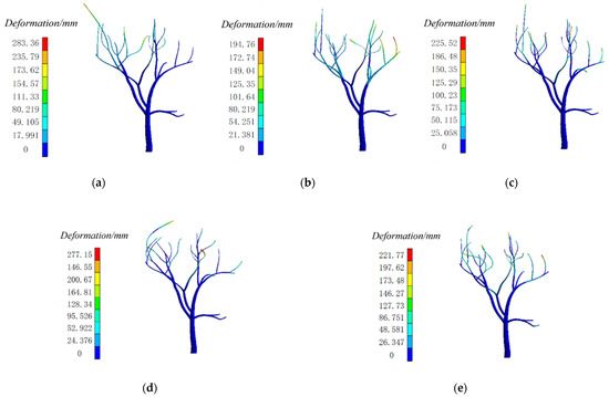 Through the comparative analysis of the free-mode nephogram with typical characteristics at A, B, C, D and E, as shown in Figure 7, it can be seen that the model response at the B, C and D frequency bands has a better overall response effect, a higher canopy response and a lower trunk response from the perspective of the overall response effect; the overall response effect of the model response in the A and E frequency bands is not very ideal, and only a few branches of the canopy respond. From the point of view of the shape variables: the model response in the A, B and C frequency bands has small shape variables, which will not cause great damage to the tree. The response of the model in the D and E frequency bands has large shape variables, and the overall structure of the tree is easily damaged when it vibrates at this frequency band. The Camellia oleifera fruits are concentrated at about 260 mm away from the crown surface [35], and only the crown vibration is required for actual harvest. Therefore, the optimal frequency range in the vibration harvesting process of Camellia oleifera can be controlled between 4~10 Hz.