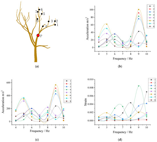 The stress at point P of the Camellia oleifera canopy and the marked positions of the eight selected points are shown in Figure 9a. When the displacement load at point P is 10 mm, the acceleration response at the eight selected points is shown in Figure 9b. There are multiple peaks, including two obvious peaks. The peaks at the detection points on the different branches are inconsistent. The acceleration responses of test points two and six reach 92 and 100 m/s2, respectively, at 9 Hz, which are relatively large. In addition, the acceleration responses of test points six and seven reach 62 and 50 m/s2 at 5 Hz, which are also large.