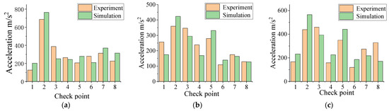 It can be seen from Figure 10 that the acceleration in the test is close to the simulation value. It can be seen from the figure that most points have similar trends, but a few points have different trends. Under the different excitation parameters, the maximum acceleration occurs at the detection point two. Compared with Figure 10a,b, it is found that the acceleration response of the different detection points is not linearly correlated with the frequency, that is, the acceleration response of the different branches is non-linearly correlated with the frequency; comparing Figure 10b with Figure 10c, it is found that the overall change trend is basically unchanged, but the acceleration value is different. Therefore, the acceleration response of each detection point is correlated with the amplitude, that is, the acceleration response of each branch increases with the increase in the amplitude.
