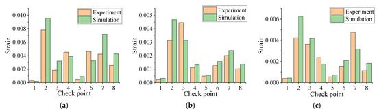 It can be seen from Figure 11 that the strain in the test is close to the simulation value. It can be seen from the figure that most of the points have similar trends, but a few points have different trends. Under different excitation parameters, the maximum strain appears at the detection point two. Compared with Figure 11a,b, it is found that the strain at the different detection points is not linearly correlated with the frequency, that is, the acceleration response of the different branches is non-linearly correlated with the frequency; comparing Figure 11b with Figure 11c, it is found that the overall change trend of the analog value basically does not change, only the difference of the acceleration value. Therefore, the acceleration response of each detection point is correlated with the amplitude, that is, the acceleration response of each branch increases with the increase of amplitude.