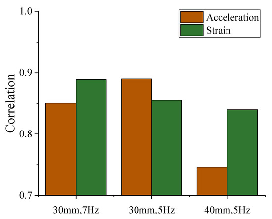Analyzing the correlation between the test value and fitting value can further elucidate the accuracy of the simulation value. The correlation coefficient between the simulation value and the test measurement value is shown in Figure 12. When the frequency is 5 Hz and the amplitude is 30 mm, the maximum correlation coefficient of the acceleration response is 0.89, it shows that the simulation analysis results can represent 89% of the real test results; when the frequency is 5 Hz and the amplitude is 40 mm, the minimum correlation coefficient of the acceleration response is 0.74, it shows that the simulation analysis results can represent 74% of the real test results. When the frequency is 7 Hz and the amplitude is 30 mm, the maximum correlation coefficient of strain is 0.89, this shows that the simulation analysis results can represent 89% of the real test results; when the frequency is 5 Hz and the amplitude is 40 mm, the minimum correlation coefficient of strain is 0.83, this shows that the simulation analysis results can represent 83% of the real test results.