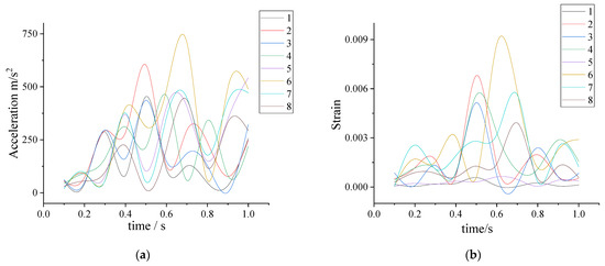 A simple harmonic load with a frequency of 9 Hz and an amplitude of 56 mm is applied to point P (Figure 9a). The acceleration response and maximum strain values of each detection point are shown in Figure 13, through transient analysis. The maximum acceleration of test point six in the eight selected points is 710 m/s2,