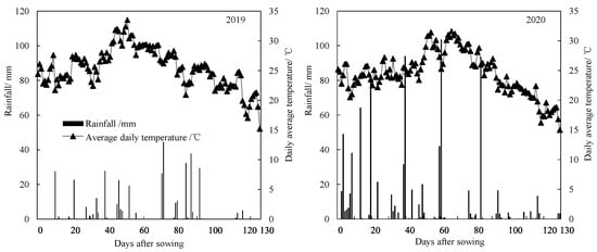 Rainfall (line) and daily average temperature (bars) at the experimental site during the 2019 and 2020 rice growth seasons.