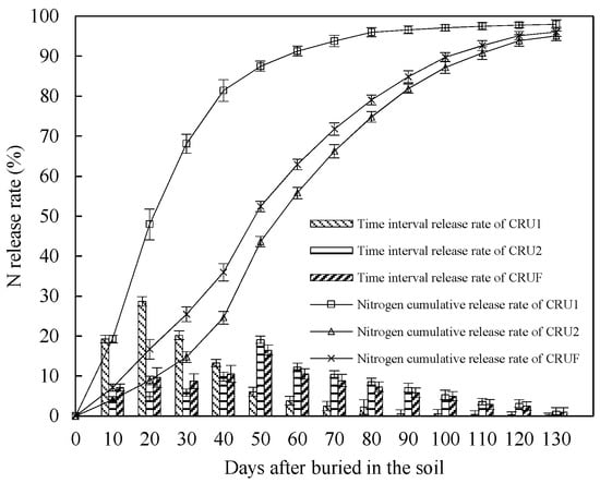 The cumulative release of N from CRU1 and CRU2 in the field gradually increased with time, and the release rates of both showed a pattern of increasing and then gradually decreasing (Figure 2). Nonetheless, the N release patterns of CRU1 and CRU2 were significantly different. CRU1 showed a very rapid release in the first 20 d, and the N release rate reached 28.7% at 10–20 d. The release rate gradually decreased thereafter, and over 80% of the N was released by 40 d. CRU2 showed a gradual increase in release rate during the first 50 d, with a maximum N release rate of 19.1% at 40–50 d. After 50 d, the N release rate gradually decreased, and over 80% of the N was released within 90 d. The maximum rate of controlled-release urea formula release occurred at 40–50 d, and the cumulative rate of release reached 80% at 80–90 d. These results suggest that the N release period of the controlled-release urea formula is approximately 80–90 d.