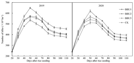 Tiller dynamics of direct-seeded rice under the different N treatments are shown in Figure 3. The number of rice tillers first increased and then decreased, and the highest number of tillers was recorded at 50 DAS. N treatments had a significant effect on the number of rice tillers. Among the one-off basal N treatments, the number of rice tillers was significantly higher in the BBU1 treatment than in the BBU2 and BBU3 treatments. Compared with tiller numbers in the BBU2 and BBU3 treatments, the number of tillers in the BBU1 treatment was 4.5–7.4% and 11.6–20.7% higher, respectively, at 50 DAS. The number of tillers in the CK treatment was not significantly different from that in the BBU2 treatment, but it did differ significantly from that in the BBU1 and BBU3 treatments. Compared with the BBU1 treatment, the CK treatment had 7.2–9.8% lower tiller numbers at 50 DAS.