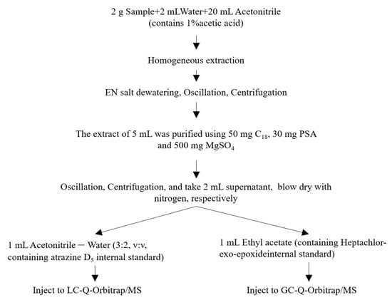 Five milliliters of supernatant was pipetted into a 15 mL clean-up tube (containing 500 mg MgSO4, 30 mg PSA, and 50 mg C18). The clean-up tube was shaken for 10 min, followed by centrifugation at 4200 rpm for 5 min. Subsequently, 2 mL of the supernatant from the clean-up tube was pipetted into a 10 mL glass tube and evaporated to dryness in a 40 °C water bath with a gentle stream of nitrogen. Finally, 1 mL of acetonitrile/water (3:2, v/v) solution was used to re-dissolve the solution and pass it over the membrane for UHPLC-Q-Orbitrap/MS analysis, or 1 mL of ethyl acetate was used to re-dissolve the solution and pass it over the membrane for GC-Q-Orbitrap/MS analysis. The flow chart of the silage sample analysis program is shown in Figure 1.