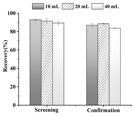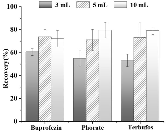 The volume for purification is also one of the factors affecting the responses of target compounds. The interferents have a more significant effect on the target compounds as the volume for purification increases, and conversely, the interference effect is smaller. However, a small purification volume will result in lower mass spectrometry detection concentrations, reducing the sensitivity for some compounds. Different purification volumes of 3 mL, 5 mL, and 10 mL were optimized. By comparison, the lower volume significantly reduced the recovery of compounds. As Figure 5 shows, for buprofezin, when the volume for purification increases, the recovery increases from 60.6% to 73.9%, while phorate and terbufos increase from 54.9% to 79.6%, and from 53.4% to 79.2%, respectively. However, the target pesticides were affected by interferents with a lower response as the volume for purification increased. In the case of organic nitrogen compounds (such as fluazifop-butyl and buprofezin), the highest response of buprofezin was achieved at a purification volume of 5 mL, and the response was essentially the same at 3 mL and 10 mL. For fluazifop-butyl, the response decreased when the purification volume increased. The purification volume selected was 5 mL, to reduce the influence of interferents on compounds, and to improve the recovery of compounds.