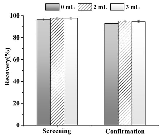 Silage has a high fiber content and a low water content (<70%). Homogenizing the extraction without water will lead to uneven samples and will affect the extraction efficiency of the target compounds []. Under a spiking level of 100 μg kg−1, this work investigated hydration volumes of 0 mL, 2 mL, and 3 mL. The optimal conditions were selected according to the percentage of recoveries of target compounds in silage. As shown in Figure 3, 90% of the target compounds could be screened out if the extraction was carried out without water. While there were relatively few compounds that met the hydration recovery criteria, the percentage of quantification was 93%. The above results indicate that the target compounds could not be effectively transferred from the matrix to the extraction solution. Therefore, water was added to the sample for hydration before extraction, to improve sample dispersion and to increase solute transfer efficiency. When the hydration volume was 2 mL or 3 mL, the screening rate of pesticides was 97.7%, and the quantification was 95.3% and 94.6%, respectively. Both the screening and the quantification were higher than those without hydration.