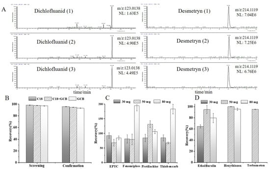 The effects of salting-out agent and purifying agent on compounds. (A): The effects of salting-out on the response of compounds Dichlofluanid and Desmetryn; (1): AOAC, (2): EN, (3): QuEChERs; (B): The effect of purifiers on screening; (C): The effect of C18 on recovery; (D): The effect of PSA on recovery.