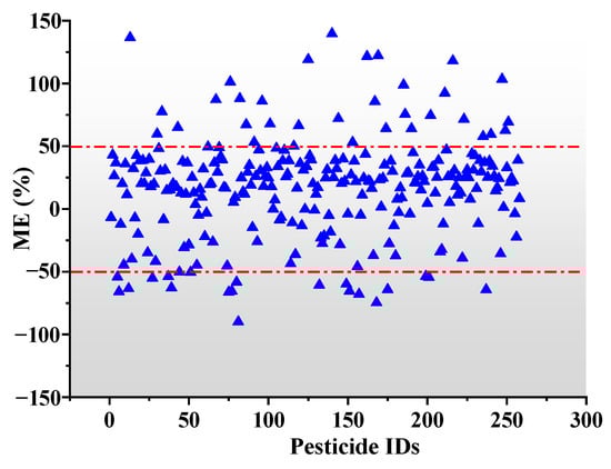 As shown in Figure 6, 27.1% of the compounds showed a weak matrix effect, 52% showed a medium matrix effect, and 20.9% showed a strong matrix effect. As a result, the matrix-matched calibration standard was used for quantitative analysis to reduce the matrix effect.
