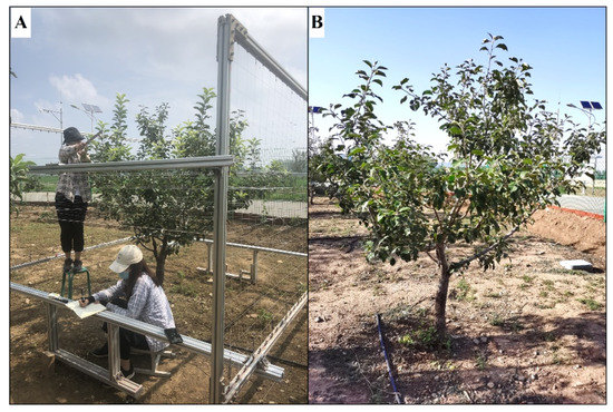 Manual measurement process of canopy leaf area (A) and the test orchard tree (B).