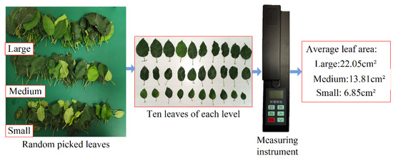 In this experiment, the method of sampling and statistical measurement was used to calculate the canopy leaf area. A total of 219 leaves of different sizes and shapes were randomly selected in the orchard (Figure 3). The leaves were divided into three size grades: large, medium, and small. Ten leaves were selected from each grade. The leaf area was measured with a leaf area meter (YMJ-G, factory number: FK20200731001; manufacturer: Shandong Fangke Instrument Co., Ltd., Weifang, China). The leaf area of each stage was measured and weighted to average. For the leaves at the grid boundaries, two-thirds of the leaves were recorded in the grid, whereas the remaining leaves were counted in the next grid. The number of leaves were 76, 55, and 88 in the large, medium, and small size grades, respectively. The leaf area of each grade was multiplied by the number of leaves, and the leaf areas of the three grades were added to obtain the total leaf area. The area ranges of large, medium, and small level leaves were 17.12–29.83 cm2, 11.01–18.87 cm2, and 3.22–12.92 cm2, respectively. This leaf area was compared with the total value measured by the instrument, and the relative error was 1.8%. This result proves that the proposed method is feasible and appropriate for this experimental study.