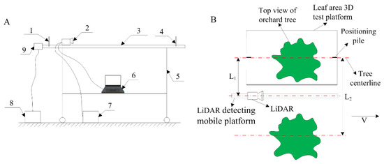 LiDAR detection mobile platform and schematic diagram: (A) schematic diagram, including the starting position of the sign board (1), LiDAR (2), linear rail guide (3), end position of the sign board (4), mobile platform (5), computer (6), power supply (7), stepper motor controller (8), and stepper motor (9); (B), LiDAR detection mobile platform operation, top view.