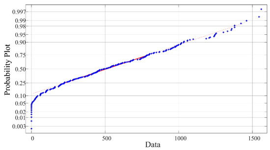 The next step was to determine whether the data conformed to the normal distribution, before removing outliers from the test data. MATLAB software was used for this process. The norm plot function was used to draw the normal distribution probability diagram of the original data (Figure 6), and the sample data in the figure are represented by “+”. The probability diagram shows the relationship between the cumulative frequency distribution of the sample and the cumulative probability distribution of the theoretical normal distribution. Figure 6 shows that the graphic display is approximately linear, and the data obey a normal distribution.