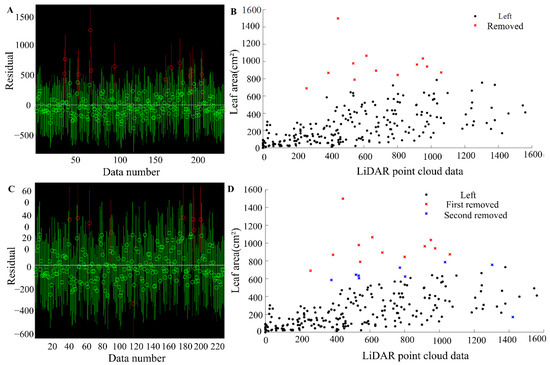 This study focuses on the problem of thick orchard tree canopies and the difficulty in establishing a relationship model between the LiDAR point cloud and canopy leaf area data. Since the laser beam does not penetrate the orchard tree canopy, due to the influence of the branches and trunks, and because the distribution of leaves in different positions in the orchard tree canopy differs, the individual plots of the obtained LiDAR point cloud numbers have unusual specificities, since individual anomalies obscure the relationship for the entire data set. If these abnormal points cannot be reasonably found and removed, they will bias the data and lead to faulty conclusions about the studied correlations. The residual method was used to remove anomalous data and noise from the measurements and eliminate their effects during the establishment of the model. After 17 iterations, 126 sets of experimental data were obtained, the R2 value in the model statistics Stats was 74.4%, an increase of 48.4%. Compared with the 36 data sets of Sanz et al. (2011) [21], the measurement data repeated three times for 84 areas by Zhang et al. (2017) [22], the 20 data sets of Mahmud et al. (2021) [23], and the 20 data sets of Berk et al. (2020) [24], our data, with 126 sets, exhibited strong reliability and could reflect the internal relationship between the number of LiDAR point clouds and the canopy leaf area.