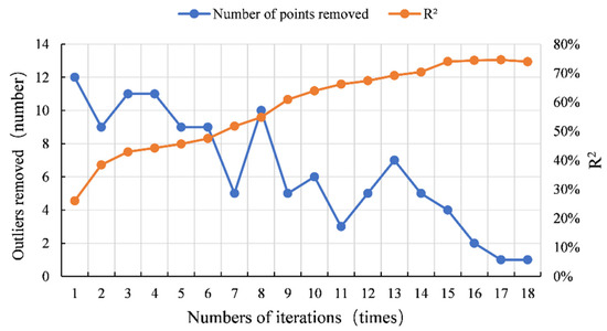 The result of data iteration is shown in Figure 8, which was completed after a total of 17 iterations. After the 17th iteration, only one point was removed from the data for five consecutive iterations. Thus, the number of iterations was complete after the 17th iteration, and all outliers had been removed. The R2 value in the comparative statistical analysis model Stats gradually increases with the increase in the number of iterations (1–17); the value increased from 26% after the first iteration to 74.4% after 17 iterations, an increase of 48.4%. After the 18th iteration, the R2 value of the data decreased and was 73.95%. The p value of 8.9 × 10−39 in Stats was less than 0.05, and the data had a significant regression level. There was a significant regression relationship between the LiDAR point cloud data and the leaf area. Through the above analysis, the outliers were completely removed after 17 iterations of the data. This shows that the outliers removed by the residual method were reasonable, and that this data processing method can be applied to this research.
