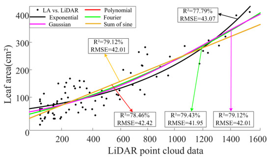 The result of the equation diagrams obtained with the five functions is shown in Figure 10. This figure shows that there is a one-to-one correspondence between the dependent variable and the independent variable. As the value of the LiDAR point cloud data increases, the corresponding leaf area increases, which intuitively reflects the true relationship within the data and conforms to the real-world situation. The obtained graphs illustrate the importance of removing outliers in a reasonable and effective manner. The R2 value of the Fourier function and Gaussian function was greater than the R2 of the other three functional fitting equations during the whole iteration process, which is consistent with the data distribution. The equation of the Fourier function was the best, and the maximum R2 value was 79.4%. The smaller the RMSE value, the more concentrated the data [33,34]. Comparing the RMSE of the equation reveals that the Fourier function had the smallest RMSE, which indicates that the equation was optimal. This result is consistent with the results of the above mentioned R2 value comparison. Analyzing the R2 and RMSE of the equation reveals that the Fourier function is better than the other equations.