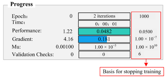 The training process of the BP neural network regression model is shown in Figure 11. In the calculation process, mu is the error accuracy, which is used to add another modulation to the weight of the neural network, to avoid falling into a local minimum during the training of the BP neural network. Its range is 0–1. Epoch is the training times. The progress bar shows the actual training times. Time is the time used in this training. Performance refers to the maximum mean square error (mse). The progress bar shows the current mean square error, and the right shows the set mean square error. If the current mean square error is less than the set value, training is stopped. Gradient is the current gradient value displayed in the progress bar, and the set gradient value is displayed on the right side. If the current gradient value reaches the set value, training is stopped. Generalization ability check is a validation check. The output error obtained after the validation of the sample data is input is obtained. Generally, the number of steps of the validation set is set to 6. If the error does not decrease, but instead rises for six consecutive training iterations, the training error of the training set is no longer reduced, and then the training is forcibly ended, to prevent overtraining.