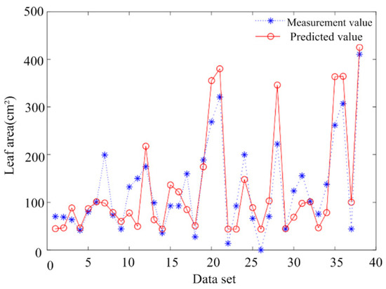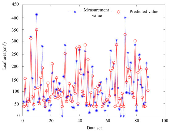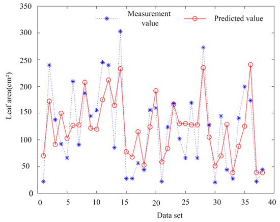 Figure 14 shows the results of data analysis using the PLSR algorithm. The red line in the figure is the predicted value of the leaf area detection model based on the measurement set data, and the blue line is the measurement value used for modelling the leaf area detection model. The figure shows that the predicted value of the model on the measurement set data was relatively close to the measured value, and the change trends were similar. The R2 of the obtained model was 78.46%. Compared with the polynomial regression model, the R2 value for the PLSR model was greater than the exponential equation, equal to the polynomial and sum of sine function equations, and smaller than the Gaussian and Fourier functions. The R2 values of the leaf area detection model obtained by polynomial regression and the leaf area detection model obtained by PLSR were both smaller than those of the BP neural network.