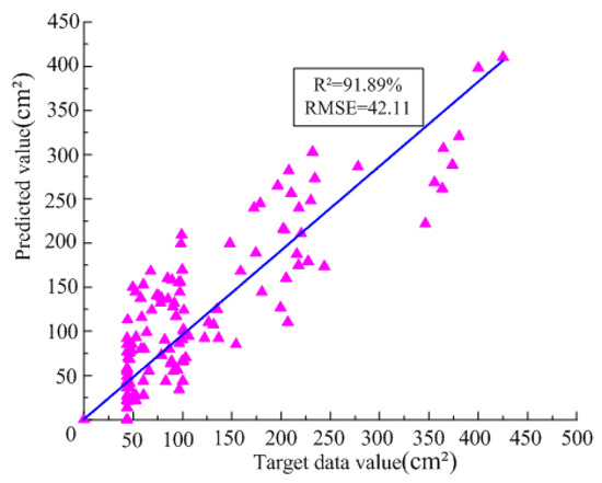 The R2 of the target data and predicted values of BP neural network test set was 91.89%, and the RMSE was 42.11. The R2 of the leaf area detection to the model was 89.87%, the accuracy of the model was higher than that of the Fourier function obtained by polynomial regression, and the accuracy of the model was improved by 10.47%. According to the above analysis, the BP neural network regression model had a good predictive ability and a strong ability to explain the data. This shows that the accuracy of the leaf area regression model could be effectively improved by using the BP neural network regression model, and the leaf area detection model obtained was better and could be applied to the calculation of the leaf area for a variable spray.