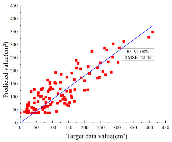 The calculation result of the obtained BP neural network regression model prediction set is shown in Figure 12. The red and blue lines are the predicted and measured values, respectively. The curve shows that the gap between the two sets of data is relatively small, and the trends are relatively consistent. The predictive ability of the BP neural network leaf area regression model on the prediction set was 79.36%, and the data fitting effect was good. Figure 13 shows the prediction correlation analysis of the overall data obtained by the BP neural network model.