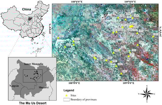 Study area of the Mu Us Desert, China, and 32 investigated field sites from 1983 to 2015. The black and yellow triangle represent the field sites.