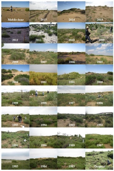 The aerial seeding in the study area uses planes to broadcast the grass seed suitable for the local environment on the barren hills or sandy land and carry out the enclosure and care management (e.g., grazing prohibition) until the vegetation is restored. Thus, the purpose of sand prevention and control can be achieved. Aerial seeding has been implemented since the 1980s, and due to the large area of the Mu Us Desert and there being almost no surface water source, irrigation and fertilization cannot be implemented, so aerial seeding is carried out in May to June (there is a natural sand cover process before the hot rainy season in July to August) to ensure that the seeds have sufficient water and heat to germinate and grow after they fall. According to the terrain difference, the mixed species seed sowing is about 6.0–7.0 kg/ha, and the amount of seeds in unfavorable terrain (low survival rate) such as sloping land is higher than that in good terrain such as flat land (high survival rate). On this basis, no artificial intervention measures such as irrigation and fertilization are required. The sand area must be at least 70 ha for aerial seeding; otherwise, it is not conducive to the operation of the aircraft. The main species being broadcast are Hedysarum laeve Maxim. (50%) and Hedysarum scoparium Pall. var. mongolicum (Turcz.) Turcz. ex B. Fedtsch. (50%), which are introduced alien species that are suitable for dry sandy land and will be replaced by native species in the late succession. We selected 30 sites that have been aerial seeded from 1983 to 2015 (excluding 1986, 1988, and 2003), 1 non-aerial seeding mobile dune site, and 1 original (top community and undisturbed >30 years) reference site, for a total of 32 sample sites, and we photographed the overall condition of each site (Figure 2). According to the local forestry bureau records, the aerial seeding time of the sites was determined. Since the 1980s, aerial seeding has been performed in many local plots yearly, but success is not guaranteed for all plots. The successful restoration areas were chosen as study sites. The initial state of the degraded sites before aerial seeding was mobile dunes.