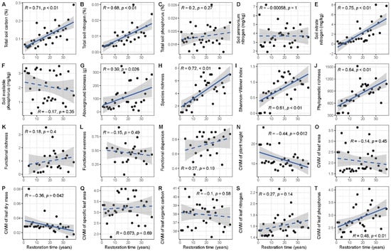 The correlation relationship between indexes in each criterion layer and restoration time. (A–T) Blue solid and dashed lines indicate significant and nonsignificant results of correlation, respectively, with grey shaded areas indicating the 95% confidence interval. Black filled circles are the value of the field sites. CWM indicate the Community-Weighted Mean Trait Values in (N–T).
