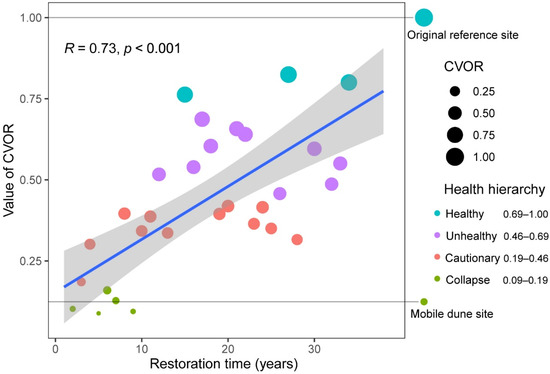The correlation relationship between grassland ecosystem health (CVOR) and restoration time.