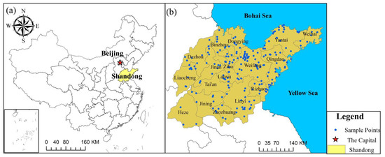 (a) Location of Shandong Province in China. (b) Distribution of survey sample sites in Shandong Province.