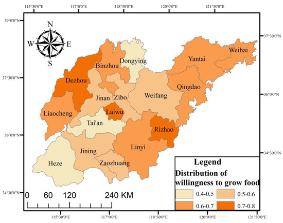 Willingness to grow grains in different cities in Shandong Province.