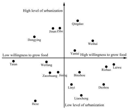 The 17 municipalities were divided into four categories (Figure 3), namely: high urbanization level and high willingness to grow food, high urbanization level and low willingness to grow food, low urbanization level and high willingness to grow food, and low urbanization level and low willingness to grow food. Using the average value of urbanization level and willingness to grow food as the critical values, the value more significant than the average level is the high value, and the value less than the average level is the low value.