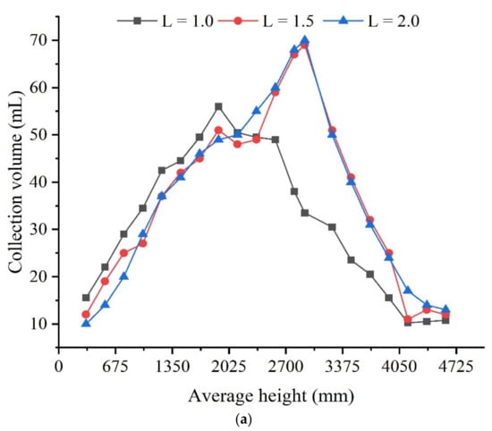 Figure 6 shows the influence of the spray distance on the collection volume at different blower speeds (2400 r/min and 2800 r/min) for a spray angle of 60°. The results shown in Figure 6a,b indicate that at a constant spray angle, when the blower speed and the spray distance increased, the peak of the curves moved to the right and increased slightly. The rate of increase was unchanged, and the rate of increase became higher while the collection volume of the lower collection plate decreased.