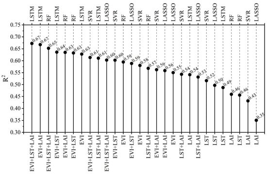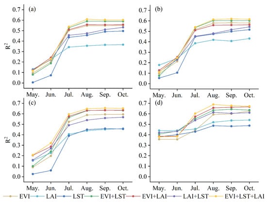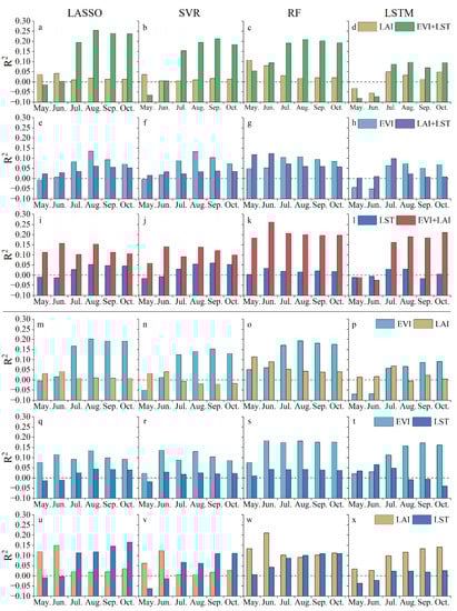 - The second question was answered by designing the second group of experiments that focused on the temporal progression of model performance for successive months and was used to highlight predictive performance changes within the season of the model for corn yield. For any month during the GS, satellite data from the beginning of the GS to the current month were used as inputs to predict the corn yield at harvest. The approach allowed for the determination of the progression in model performance for different satellite data inputs. These results helped identify the added value of satellite data over time for the prediction within the season. In addition, the optimal time during the GS could be identified for predicting corn yield using different methods and inputs. For example, the earliest month for obtaining an accurate corn yield estimate could be identified at the county level.
