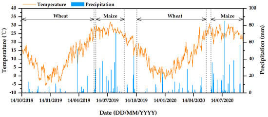 The experiment was located at the crop high-yield experimental station in Xuchang City (started in 2010, 34°03′ N, 114°25′ E), Henan Province, China, with a winter wheat and summer maize rotation system. The area has a continental monsoon climate and four distinct seasons. As shown in Figure 1, the annual mean temperature and annual mean precipitation in wheat season were 11.8 °C and 356.8 mm, respectively (October 2018 to June 2019, and October 2019 to June 2020), and the annual mean temperature and annual mean precipitation in maize season were 25.2 °C and 308.2 mm, respectively (July to September 2019, and July to September 2020).