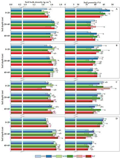 Similarly, during the maize season, the soil bulk density was lower in the 0–20 cm soil layer. The different tillage treatments showed the pattern of deep tillage < shallow tillage < no tillage. In 2020, the soil bulk density under the STF treatment was significantly lower than that under the NT treatment in the 20–40 cm soil layer (p < 0.05), while the soil porosity exhibited the opposite trend. The bulk density of STF in the 40–60 cm soil layer was significantly lower than that of NTF (p < 0.05) and the highest soil porosity was 38.1%, with the soil porosity appearing in the following order: STF > DTF > DT > ST > NT > NTF.