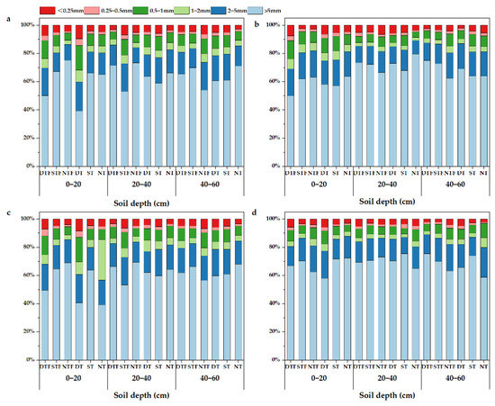 Soil aggregates for overwintering wheat in 2018–2019 (a), the maturity period of maize in 2019 (b), overwintering wheat in 2019–2020 (c), and the maturity period of maize in 2020 (d).
