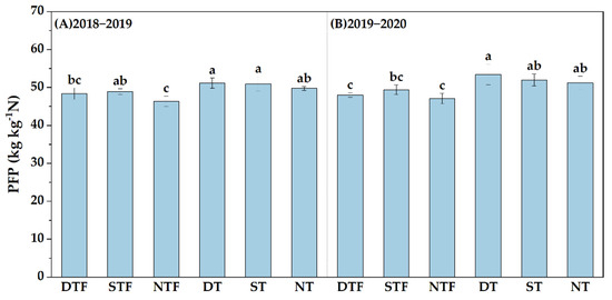 PFP of wheat and maize from 2018 to 2020. PFP from 2018 to 2020 (A) and from 2019 to 2020 (B). Different lowercase letters indicate significant differences in PFP between treatments (p < 0.05). Note: PFP is the partial productivity of fertilizer.