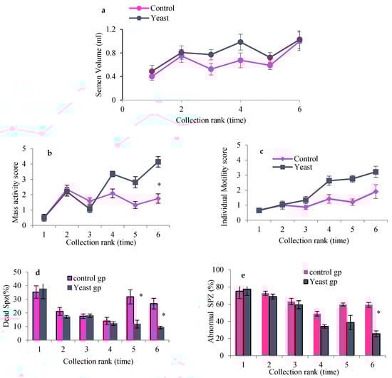 Variation in (a) ejaculate volume, (b) mass motility score, (c) individual motility, (d) dead spermatozoa rate and (e) abnormal spermatozoa rate in yeast-treated and control rams. Effect of supplementation is significant, * p < 0.05.