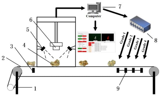 Panax notoginseng real-time sorting robot system. 1—actuation system; 2—conveyor belt; 3—photoelectric sensor; 4—taproots of Panax notoginseng; 5—bar light source; 6—industrial camera; 7—computer; 8—low-level controller; 9—jet mouth.