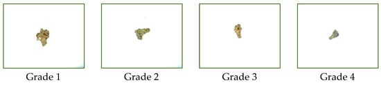In this study, Panax notoginseng in Wenshan Prefecture, Yunnan Province, was used as the experimental object. Panax notoginseng images were collected from the real-time sorting robot system of Panax notoginseng taproots. The simple structure of the sorting robot system is shown in Figure 1. The camera model is a Hikvision industrial camera (MV-CA030-20GC, 1.3 megapixel, Gigabit Ethernet industrial area scan camera, resolution 1280 × 1024). The camera is 35 cm away from the horizontal photo-taking plane. The light source model is JR-LR-400 × 30W, with a power of 16 W and a height of 16.1 cm from the conveyor belt plane. The surface brightness of the material is about 2.3 × 104 Lux. In this experiment, the real-time sorting robot system was used to collect 450 images of Panax notoginseng taproots of 20, 30, 40, and 60 heads, respectively (hereinafter referred to as grade 1, grade 2, grade 3, and grade 4), and there were 1800 images in total. The original image format is JPEG. The images of the four grades of Panax notoginseng taproot are shown in Figure 2.