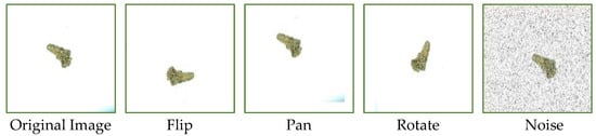 First, each type of sample in the dataset was divided into a training set and a test set at the ratio of 4:1. To further increase the diversity of samples and prevent overfitting during training, the dataset was expanded to 6000 images through image enhancement (see Figure 3). Image enhancement can expand the number of images by flipping, translating, rotating, and adding noise. Specifically, flipping is to adjust the image vertically and horizontally; translation is to shift the width of the image by 100 pixels to the right and the height by 100 pixels; rotation is to randomly rotate the image in the directions of 60°, −60°, 45°, −45°, 90°, −90°, 210°, 240°, −210°, and −240°; adding noise is to add Gaussian noise and salt and pepper noise to the image. Then, the semantic segmentation tool Lableme was used to mark the training images, the dataset name, point coordinate information, label name, and other information of the circled marked objects were written into the json file, and the PASCAL VOC dataset was established.
