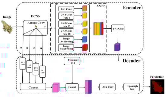 The DeepLabv3+ network was the most commonly used network in semantic segmentation due to its high segmentation accuracy and superior performance [33]. It consists of an encoder and a decoder. The encoder consists of a backbone feature extraction network and an ASPP module. The decoding part mainly extracts the shallow features of the backbone feature network, and then fuses the extracted shallow features with high-level semantic features to improve the accuracy of the segmentation model.