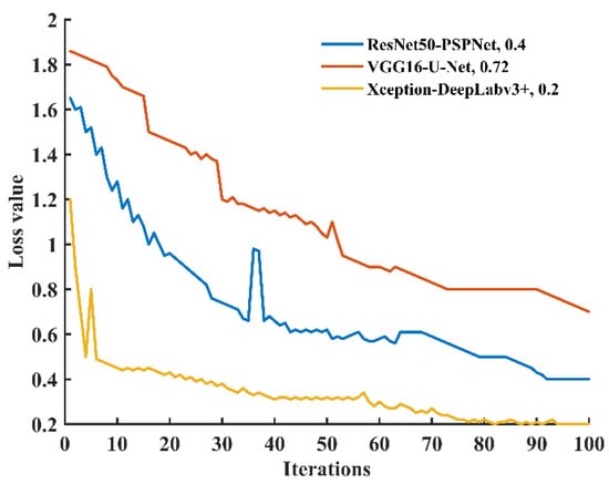 It can be seen from Figure 5 that in the first iteration of the VGG16-U-Net model, the loss value was 1.86; it did not show large oscillation in the middle and then gradually converged to about 0.72. The ResNet50-PSPNet model fitted quickly in the first 36 iterations, and the loss value decreased rapidly. In the 37–38 iterations, the loss value fluctuated greatly and then gradually stabilized at around 0.4. Before the first five iterations of the Xception-DeepLabv3+ model, the loss value decreased rapidly. During the 6–7 iterations, the loss value oscillated slightly, and after the 8-th iteration, the loss value gradually stabilized at about 0.2.