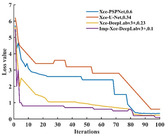 It can be seen from Figure 6 that the Xce-U-Net model fitted quickly in the first five iterations, and the loss value decreased rapidly. In the 5–75 iterations, the loss value decreased slowly, and in the 76–94 iterations, the loss value decreased again and finally stabilized at around 0.34; the Xce-PSPNet model fitted rapidly in the first 10 iterations, and the loss value decreased rapidly. Then, the loss value gradually stabilized at about 0.6 after 84 iterations. For the Xce-DeepLabv3+ model, the loss value decreased rapidly before the second iteration and oscillated from 3 to 7. Then, it gradually changed after eight iterations and converged to around 0.23. For the I-Xce-DeepLabv3+ model, the loss value decreased rapidly in the first five iterations and then gradually stabilized at around 0.1. During the training process, the quality of the model was evaluated by MPA and MIoU.
