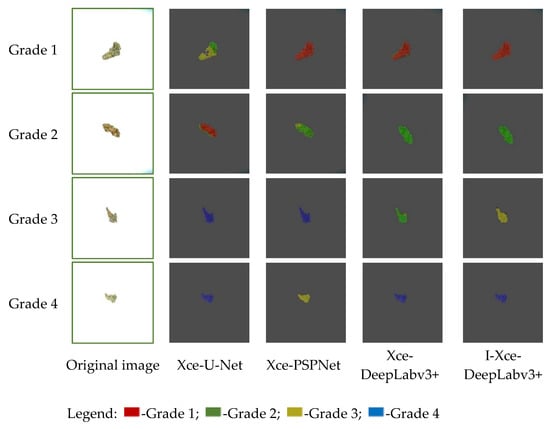 To compare the segmentation effects of the Xce-PSPNet, Xce-U-Net, Xce-DeepLabv3+, and I-Xce-DeepLabv3+ models more intuitively, four images of the taproots of Panax notoginseng of different grades were randomly selected in the test set to visualize the segmentation effects of different models.