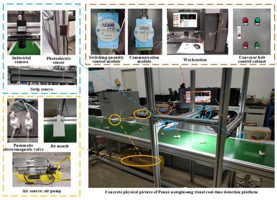 This system mainly performs feeding, image acquisition, identification, and sorting of Panax notoginseng materials. The hardware includes the vibration feeding mechanism, image acquisition mechanism, conveying and sorting mechanism, and control system. The feeding and conveying mechanism drops the taproots of Panax notoginseng from the hopper to the conveyor belt in an orderly manner. The camera in the image acquisition mechanism is located 16.2 cm above the conveyor belt, and the brightness of the light on the surface of the conveyor belt is about 2.3 × 104 Lux. The photoelectric sensor is installed on the inlet side of the conveyor belt. When the material passes through the photoelectric sensor, the camera is triggered for image acquisition and identification. The conveying and sorting mechanism consists of a conveyor belt, conveyor belt control box, air pump, solenoid valve, and jet port. The conveyor belt regulates the conveying speed through the frequency converter. The air pump provides air pressure of 0.6 mpa, and the action of the jet port is controlled by a solenoid valve to blow various materials into different sorting ports. The control system includes computer system software and a lower computer ADAM controller (ADAM-4520 and ADAM-4055, it was developed by Advantech Co., Ltd., Kunshan, Jiangsu, China, the manufacturer’s website is http://www.advantech.com/eAutomation accessed on 5 October 2021). The human–computer interaction interface on the software realizes real-time display of Panax notoginseng materials, pattern recognition, system parameter setting, and real-time control of the equipment of the lower computer. The physical exploded view of the system is shown in Figure 8.