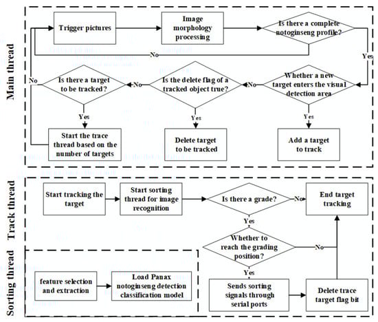 As shown in Figure 9, the control system software adopts multi-thread technology to track Panax notoginseng materials in real-time. The control system is written in the Python language, and the library functions such as camera opening, streaming, and closing are called. Meanwhile, the sorting function file is written based on the I-Xce-DeepLabv3+ Panax notoginseng sorting model. This file includes calculating the area proportion of each category region in the taproot image of Panax notoginseng after segmentation, taking the category with the highest proportion of segmented region as the recognition result of the image, and output the recognition result as the prediction result of the sorting function. The external photoelectric sensor triggers the camera to collect and process pictures in real-time and judge whether there are new materials as the main thread of the system. The sorting function is set as the sorting thread for the recognition programs of different grades of Panax notoginseng. The tracking thread is responsible for calling the sorting thread, receiving the forecast result and position information of the material, and making a judgment on the grade and real-time position. The tracking thread sends the sorting signal to the lower computer ADAM-4520 controller through the Modbus RTU protocol of serial communication, thereby driving the sorting mechanism to act. It triggers the camera to collect pictures in real-time, enables the sorting model to process in real-time, executes the program of the subordinate computer to drive the sorting mechanism in real-time, and tracks the status of Panax notoginseng on the conveyor belt in real-time. In this way, the problem that the identification signal is not synchronized with the sorting signal is solved. The flow chart of the system software control strategy is shown in Figure 9.