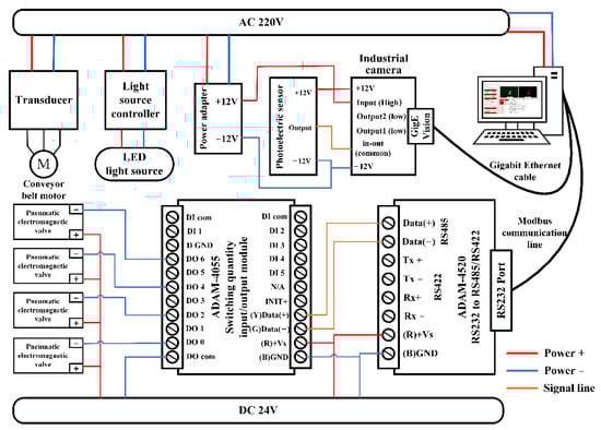 The circuit design of the system is shown in Figure 10. The devices used in this system test are powered by 220 and 24 V. The conveyor belt motor is a DC-geared motor, and the motor speed is controlled by a frequency converter. The image acquisition mechanism consists of industrial cameras, photoelectric sensors, four groups of strip light sources, and workstations. The workstation is connected to the industrial camera through the network port, and the camera parameters can be obtained and set by the software. The bar light source controls the light intensity through the light source controller. The lower computer control module includes the ADAM-4520 module, ADAM-4055 module, and solenoid valve. The ADAM-4520 module is connected to the serial port of the computer through a data cable, and they communicate through the Modbus protocol. The ADAM-4055 module receives the response signal of the ADAM-4520 module to drive the pneumatic solenoid valve to act. The pneumatic solenoid valve uses an external power supply of 24 V. The schematic diagram of the system circuit is shown in Figure 10.
