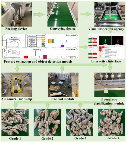 (2) At present, most of the research on the identification and sorting of agricultural products only establishes sorting models, but the models are not applied to actual processing and production. Meanwhile, only a small number of studies have achieved online sorting of agricultural products, such as apples [24], garlic [25], and carrots [26]. Baigvan et al. developed a machine vision sorting system for figs based on the LabVIEW platform, which achieves a sorting speed of 90 kg/h and a sorting accuracy of 95% [27]. Sofu et al. developed an automatic sorting system for real-time online detection of apple weighing, with a detection speed of 15 apples per second and detection accuracy of 73–96% under dual channels [28]. Wu et al. established a visual system for sorting tea based on a multi-target recognition model of region segmentation and convolutional neural network. The accuracy of the system is above 90%, and the working efficiency is equivalent to about four manual workers [29]. Dang Quoc Thuyet et al. developed a robotic system for autonomous classification and sorting of root removed garlic based on a deep convolutional neural network using vision technology and Arduino control board, with an overall classification accuracy of 89% [30]. The previous research provides the design idea for the development of the Panax notoginseng sorting system. In this study, the Notoginseng sorting model is applied to the notoginseng sorting system. Meanwhile, the python language is used to develop an integrated identification and control program for the system to avoid the problem of hierarchical asynchronism caused by multiple control cores of the system and improve the efficiency of the system. The system can realize real-time automatic sorting of the primary root of Panax notoginseng.